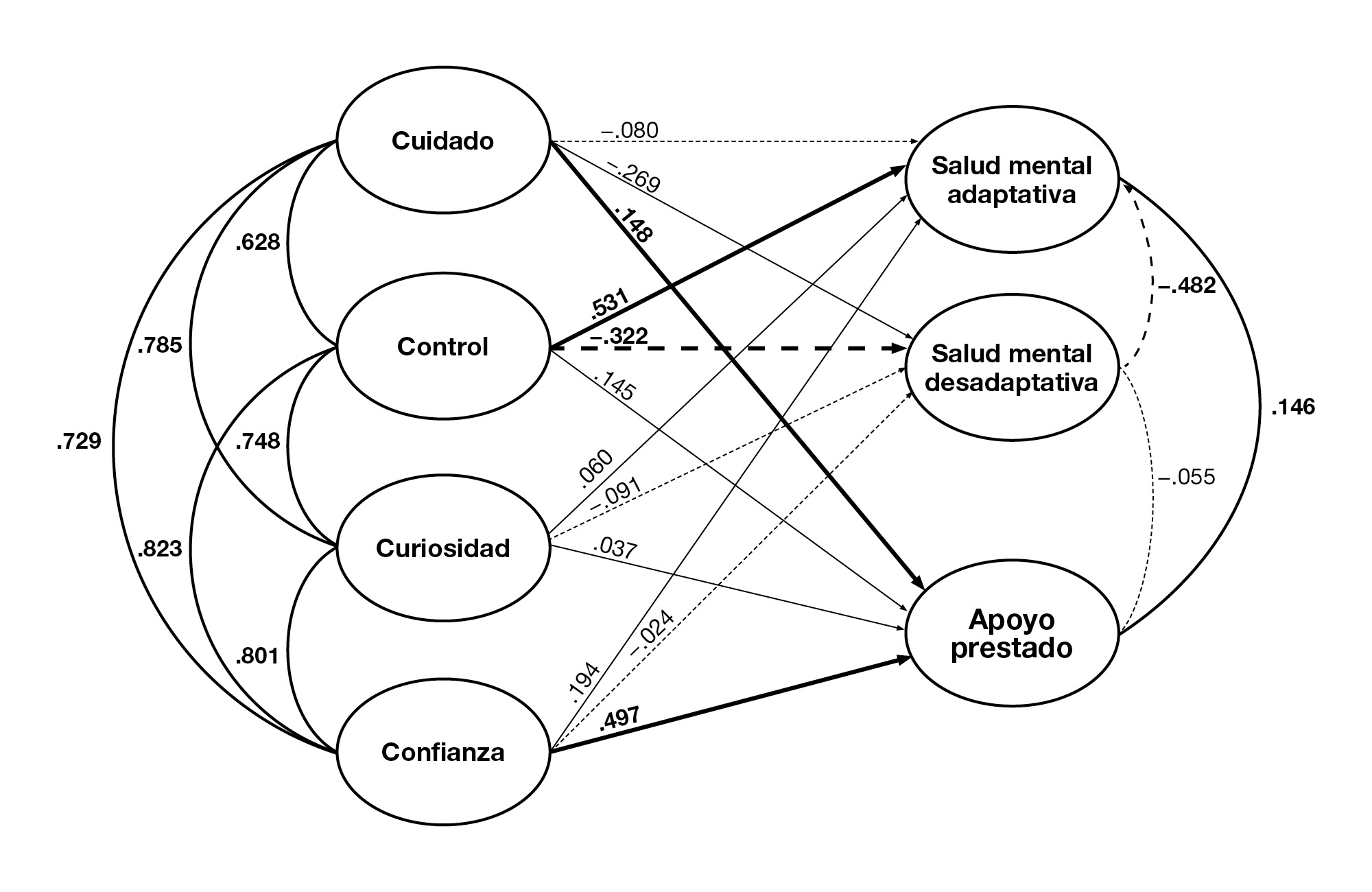 Además, también aportamos evidencias sobre la CR, validez convergente y validez discriminante. En primer lugar, utilizamos la omega de McDonald para comprobar la CR de cada escala. Los resultados fueron los siguientes: ωCuidado = .847; ωControl = .816; ωCuriosidad = .875; ωConfianza = .911; ωSalud mental adaptativa = .915; ωSalud mental desadaptativa = .869; ωApoyo prestado = .931. El valor para el modelo de medida general fue ω = .953. Todos los valores fueron > .70, lo que indicó una buena fiabilidad. En cuanto a la validez convergente, todos los ítems del estudio mostraron cargas significativas en su factor latente (>.50), siendo la mayoría de las cargas factoriales > .70. En cuanto a la validez discriminante, no encontramos ítems con cargas cruzadas y las correlaciones entre los factores latentes fueron ≤ .80. En general, los resultados del modelo general de medida los consideramos adecuados para continuar con los siguientes pasos del análisis de los datos.