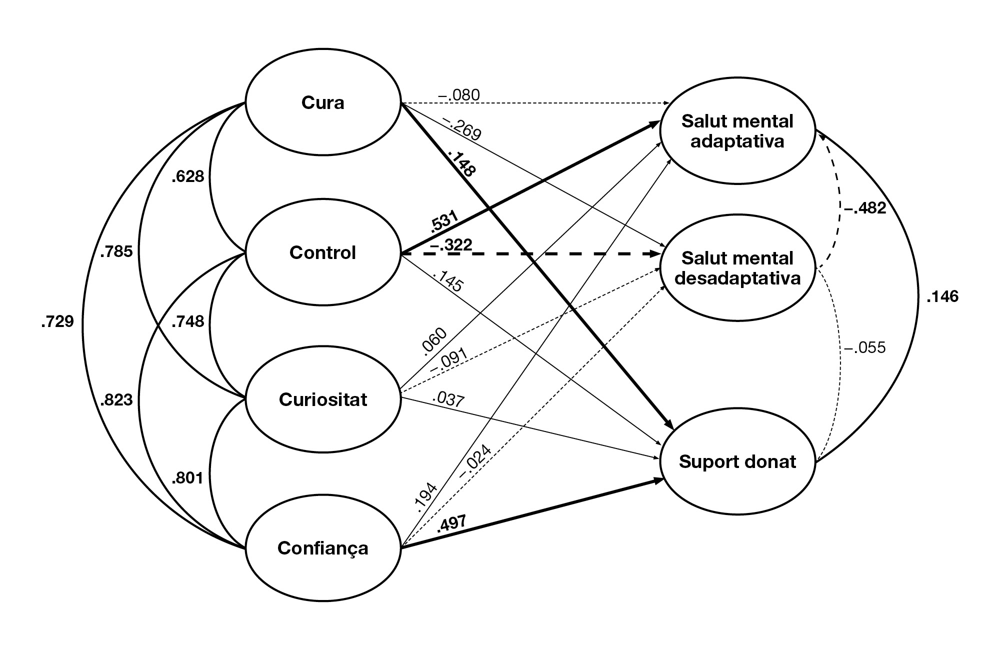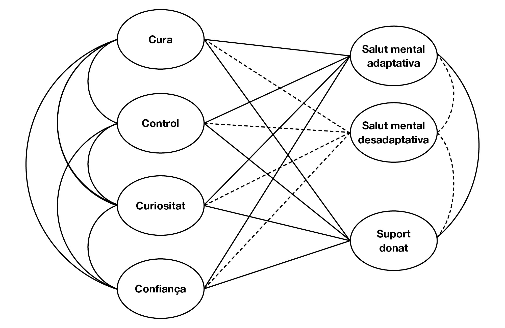 Nota. Les línies discontínues mostren les relacions negatives esperades. Cura, Control, Curiositat i Confiança són competències d’adaptabilitat de carrera.
