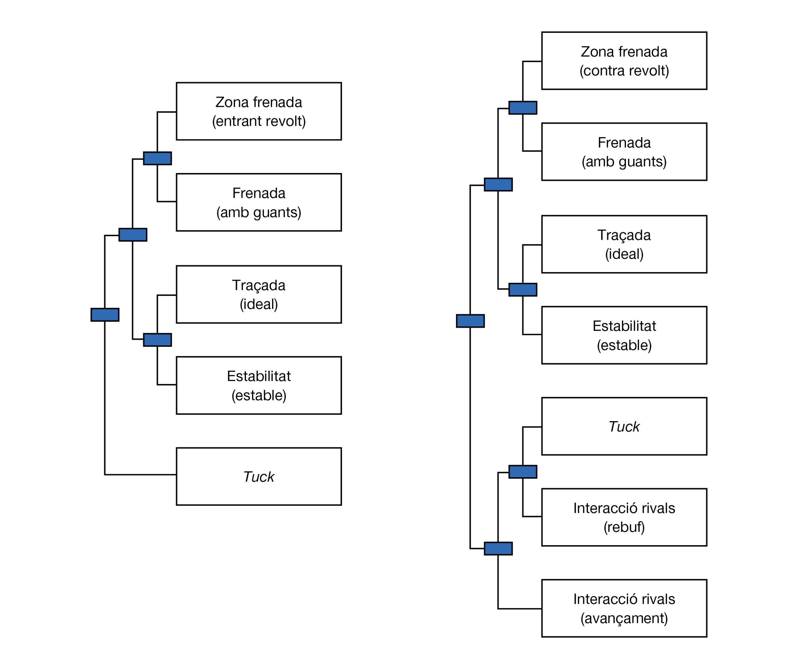 Al dendrograma de conductes de la Figura 1, es recullen les dues successions de patrons típics que van aparèixer en analitzar els comportaments dels participants durant la competició. Aquests són patrons que segueixen una successió temporal en un interval petit de temps. La successió no es diferenciava entre el posicionament dels participants. Els patrons esmentats seguien una seqüència de zona de frenada – frenada – traçada – estabilitat – tuck (+ interacció rivals) que exemplifiquem a la Figura 2.
