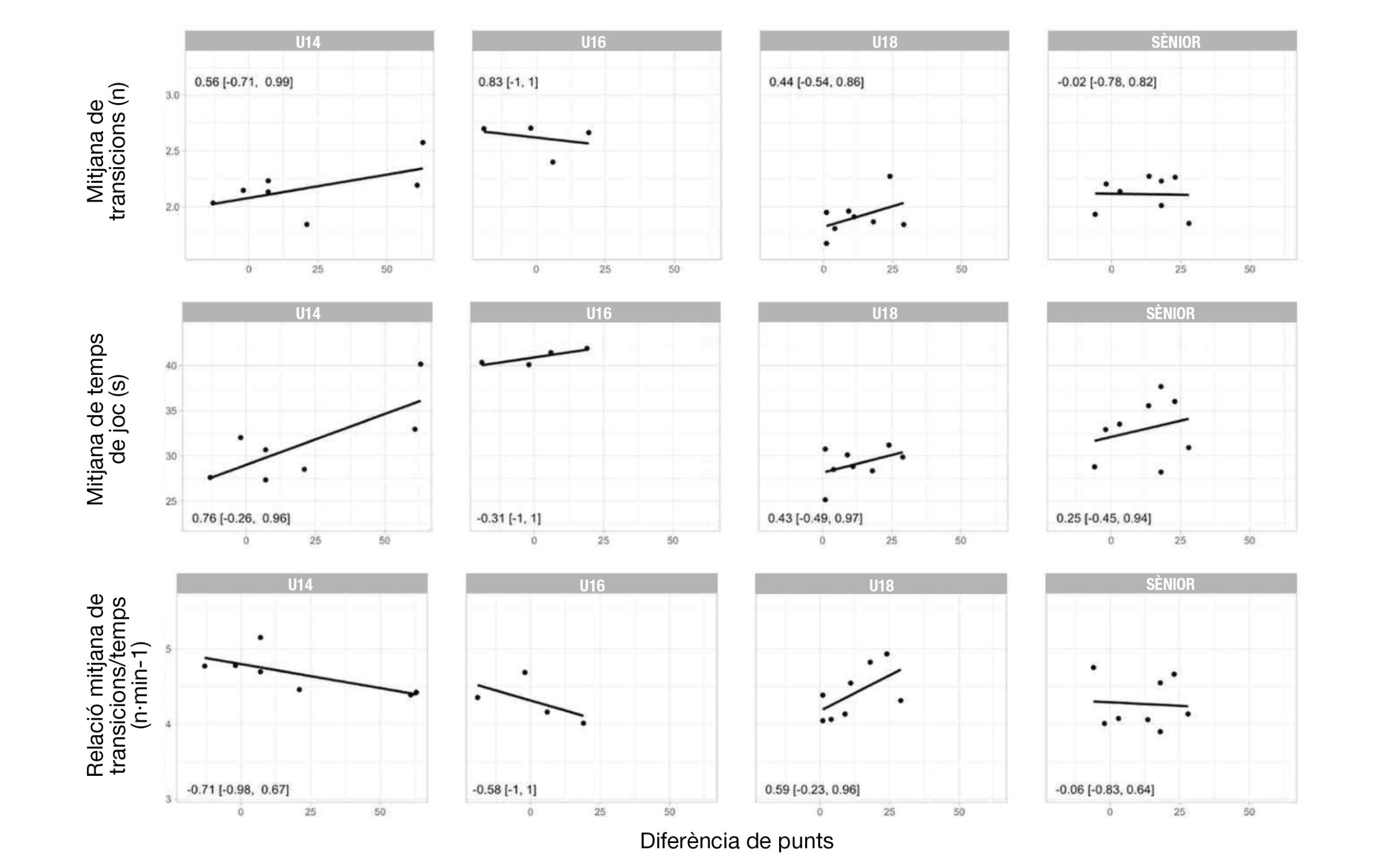 De manera similar al que va succeir amb les diferències entre quarts, el diferencial de punts entre l’equip examinat i el seu rival no va tenir una relació significativa amb les tres variables estudiades. No obstant això, el present estudi va trobar interessants les correlacions no significatives, entre moderades i molt grans, entre algunes variables i el diferencial de punts, cosa que podria implicar que cada grup d’edat té el seu ritme de joc òptim. Aquesta troballa podria comportar que no existeix una relació significativa entre les transicions per minut de l’equip analitzat i l’èxit en el bàsquet. De la mateixa manera, les publicacions actuals (Fox et al., 2020c; García et al., 2022; Vázquez-Guerrero et al., 2020b) tampoc no van trobar una relació positiva entre les càrregues d’entrenament i el rendiment en el joc en el bàsquet mitjançant l’ús de càrregues externes i internes durant la competició d’entrenament. Més en concret, els jugadors professionals de bàsquet van presentar relacions insignificants entre les variables de càrrega externa (per exemple, carreres a gran velocitat i acceleracions i desacceleracions d’alta intensitat) i interna (per exemple, freqüència cardíaca mitjana), i les estadístiques relacionades amb el joc (García et al., 2022). En general, la falta de relació entre les transicions de camp i el temps de joc, i les variables físiques i fisiològiques, amb un percentatge més gran de victòries i derrotes podria portar els professionals del bàsquet a explorar diferents factors contextuals que afecten i determinen el rendiment. Cal tenir en compte una sèrie de limitacions. Malgrat assumir la independència, encara pot existir certa dependència residual entre els grups d’edat, la qual cosa podria influir en els presents resultats. Així mateix, els resultats de les correlacions s’han d’interpretar amb cautela, ja que es poden veure influïts per la dependència de les dades, la variabilitat del mostreig i la reduïda mida de la mostra. Quant a la significació, aquest estudi ha confirmat la presència d’algunes diferències estadísticament significatives en els resultats. Tanmateix, aquestes diferències mostren una mida de l’efecte petit o insignificant; per tant, cal anar amb compte en interpretar les troballes actuals. A banda de la mida de l’efecte, una altra possible limitació podria ser el fet que tots els equips supervisats pertanyien al mateix club i jugaven amb la mateixa filosofia de bàsquet. En conseqüència, s’imposa la precaució a l’hora de generalitzar aquests resultats. A més, només es van examinar quatre partits de la categoria U16. Els estudis futurs haurien d’examinar una varietat d’equips de bàsquet més gran amb estils i competicions diferents. Es va mesurar el temps de joc continu excloent el de descans. Això permetria als professionals comprendre millor la densitat del bàsquet (quantitat total de volum realitzat en un temps determinat) i prescriure proporcions òptimes de treball i descans per millorar la preparació del jugador. Així mateix, només es van recollir dades durant els partits de bàsquet. Per tant, seria recomanable examinar també exercicis específics d’entrenament 5 contra 5 per avaluar els objectius proposats abans de la sessió.