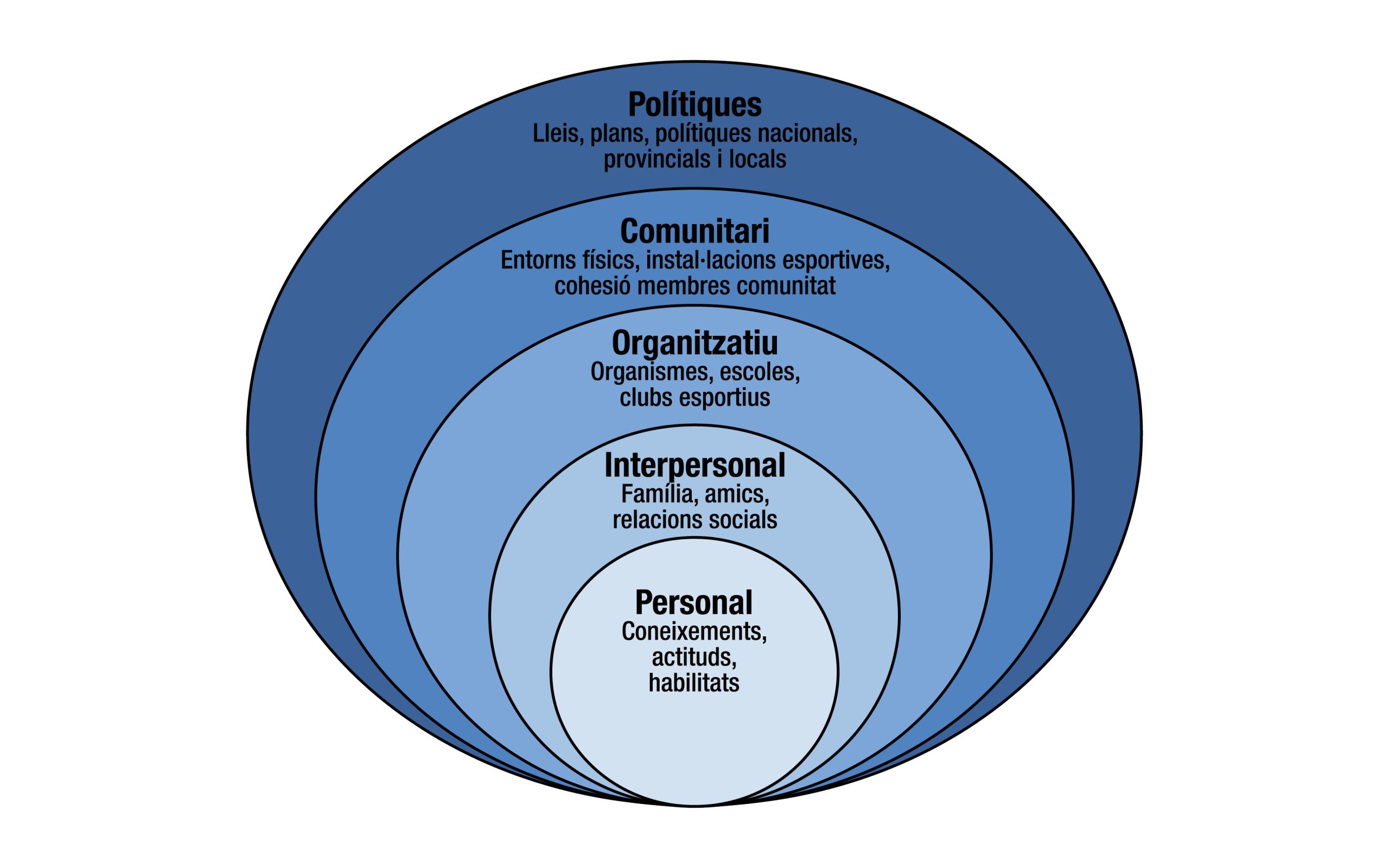 Un dels enfocaments que planteja la interacció de diferents factors i nivells és el model socioecològic (McLeroy et al., 1988). Aquest model suggereix que la salut no és només el resultat de factors individuals, sinó també de les interaccions socials i ambientals. Es compon de cinc nivells (Figura 1): personal (coneixements, actituds i habilitats); interpersonal (família, amics, relacions escolars); organitzatiu (associacions, federacions esportives i cohesió amb els membres de la comunitat); comunitari (entorns físics, instal·lacions esportives) i de polítiques públiques (lleis, regulacions, plans, tant en l’àmbit estatal com en el regional o local).
