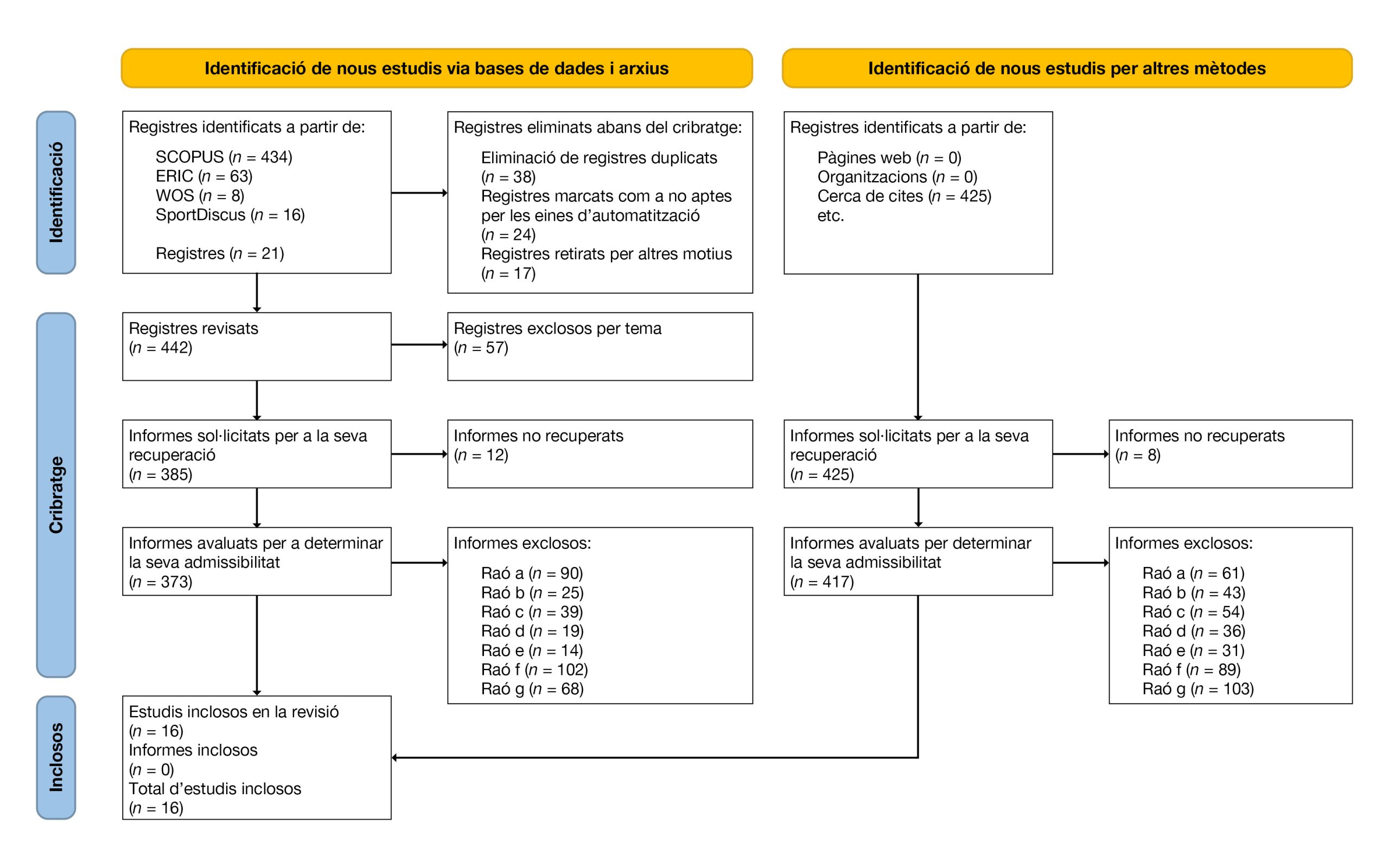 Es van revisar títols i resums per seleccionar els articles. Es van obtenir 521 registres, dels quals se’n van descartar 505 i es van seleccionar 16 articles que complien amb els criteris d’inclusió, centrats en metodologies actives i la seva relació amb la igualtat de gènere en l’assignatura d’EF (vegeu la Figura 1). A més, es van revisar les referències dels articles, però no es van trobar estudis addicionals elegibles. Dos investigadors van revisar els manuscrits de manera independent, resolent discrepàncies mitjançant consens. Davant de la possibilitat de no aconseguir l’esmentat consens, s’inclouria el criteri d’una tercera persona experta.