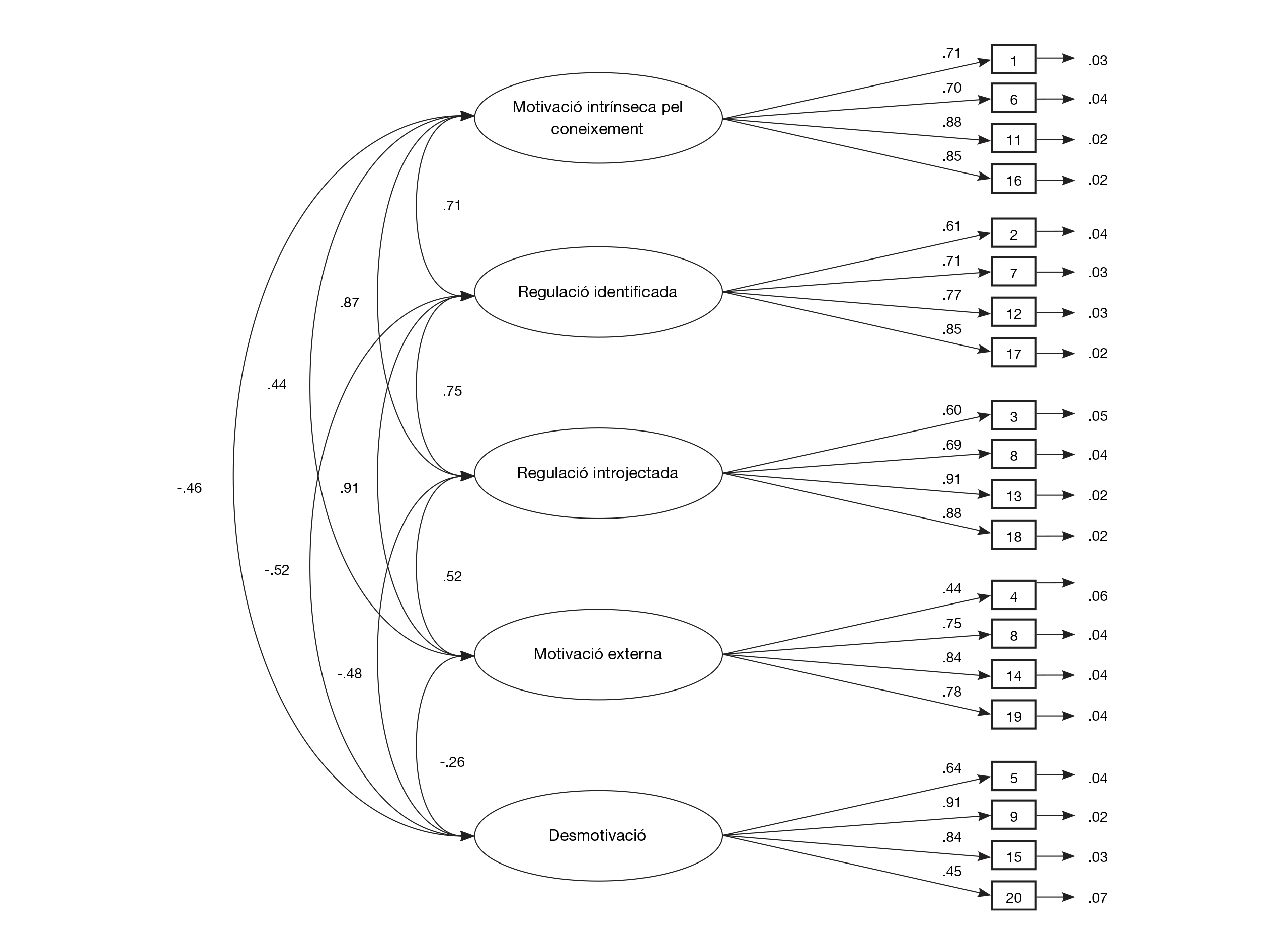 En primer lloc, els resultats de l’AFC van mostrar un bon ajustament de la TPSAMS amb cinc factors correlacionats (motivació intrínseca, regulació identificada, regulació introjectada, regulació externa i desmotivació). Les càrregues factorials de cada ítem van ser apropiades i significativament positives (Brown, 2006). Aquestes troballes són coherents amb altres escales que mesuren la motivació de l’alumnat tant en l’educació primària (CMEF-EP; Leo et al., el 2016) com en la secundària (PLOC, Moreno-Murcia et al., 2009; EME-E, Nuñez et al., 2010; CMEF, Sánchez-Oliva et al., 2012). Per exemple, Sánchez-Oliva et al. (2012) van confirmar la validesa factorial d’un model de 20 ítems dividit en cinc factors motivacionals, amb càrregues factorials excel·lents. De manera similar, la TPSAMS concorda amb les escales CMEF-EP (Leo et al., el 2016) i EME-E (Nuñez et al., 2010), que també van evidenciar una alta validesa de constructe i càrregues factorials adequades en la majoria dels seus ítems.
