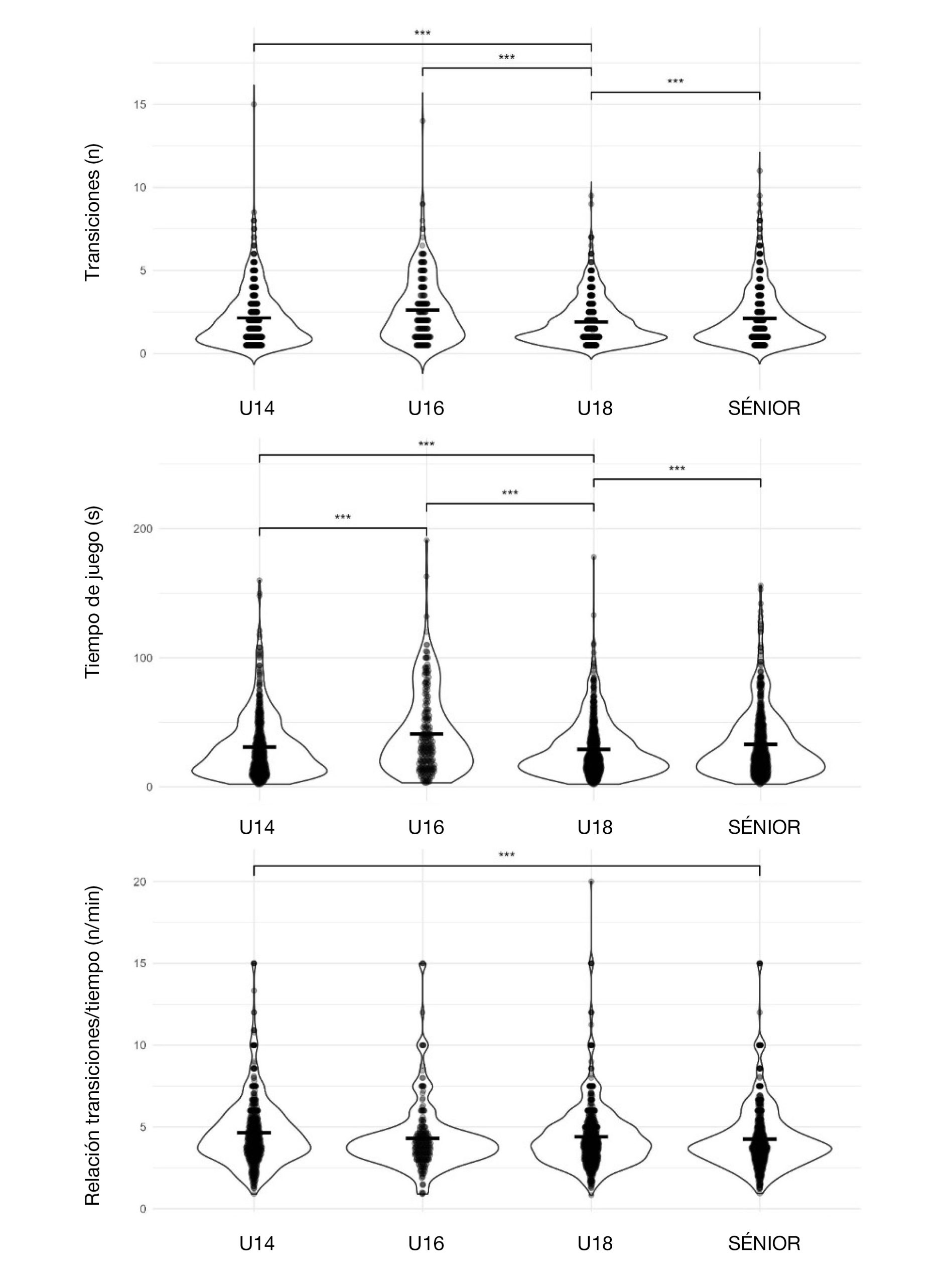 Solo se encontraron diferencias significativas entre los grupos de edad en las tres variables estudiadas (Tiempo de juego: F Iteraciones = 5000, p < .001, η2 = .02; Número de transiciones de campo: F Iteraciones = 5000, p < .001, η2 = .02; Transiciones por minuto: F Iteraciones = 5000, p < .001, η2 < .001). En las tres variables, el tamaño del efecto de la diferencia fue pequeño e incluso insignificante en la variable Transiciones por minuto. Por último, en la Tabla 5 se presentan los valores medios y máximos.