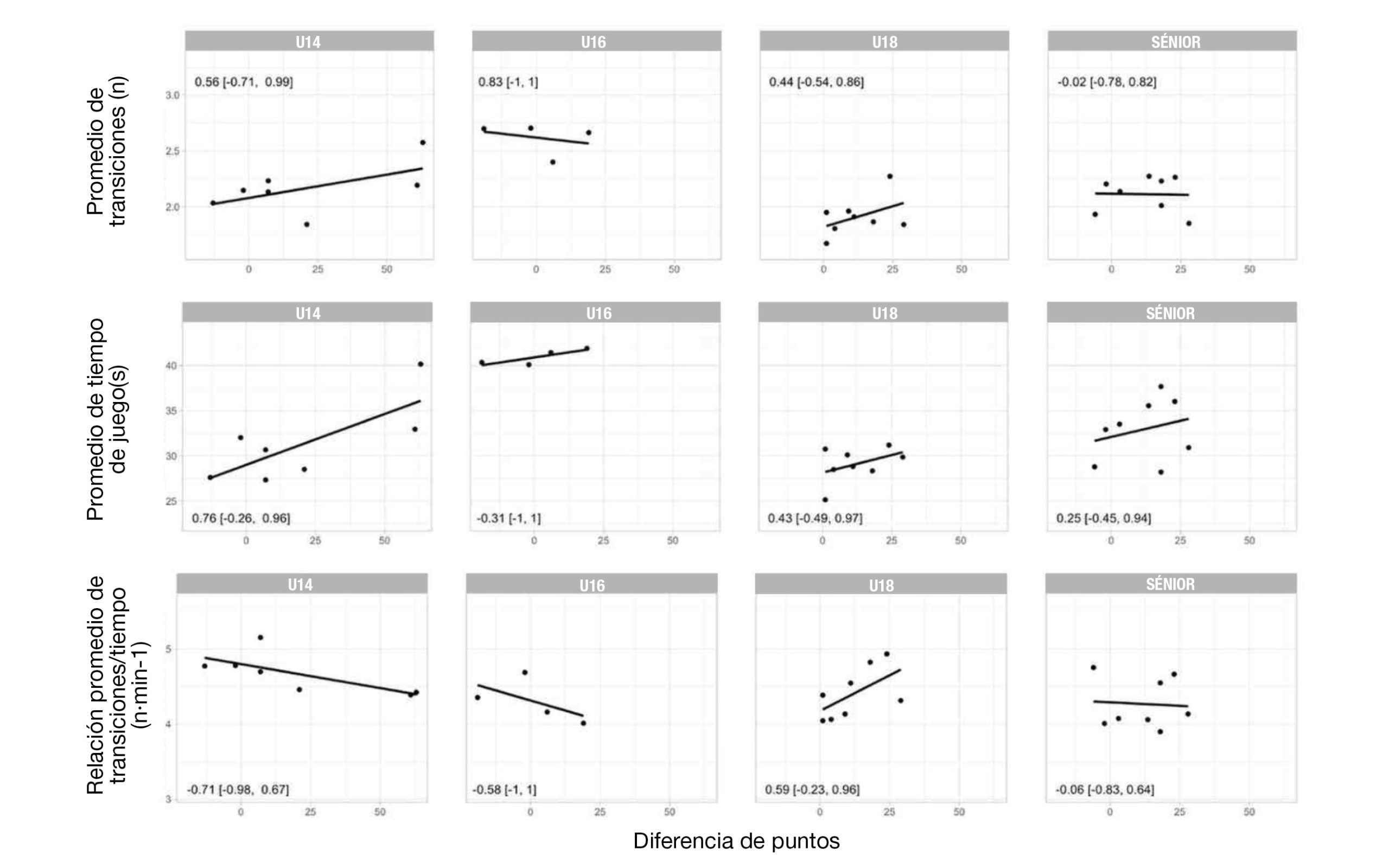 Los resultados de las correlaciones agrupadas por grupos de edad se presentan en la Figura 3. Si bien se hallaron algunas correlaciones moderadas entre las variables y el resultado del partido, ninguna de ellas fue significativa.