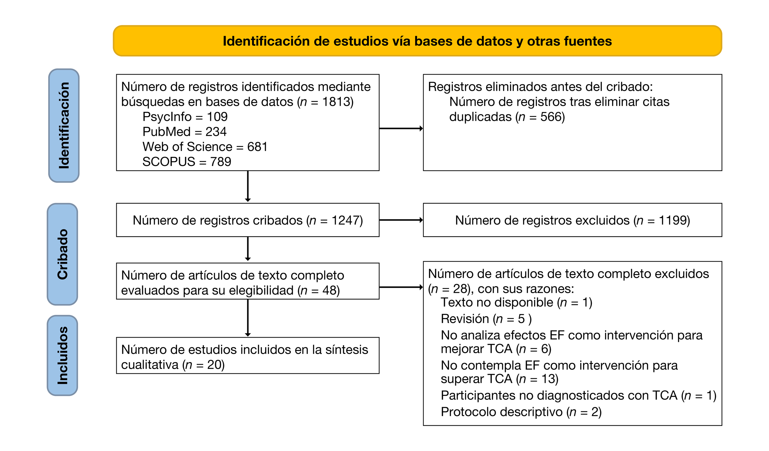 Tras excluir los registros duplicados, se consideraron aptas un total de 1247 publicaciones potencialmente relevantes. Después del cribado de los títulos y resúmenes, se aceptaron 48 publicaciones para la revisión del texto completo. Finalmente, en esta revisión sistemática se incluyeron 20 artículos (véase la Figura 1), de los cuales 10 eran estudios controlados aleatorizados (RCT).