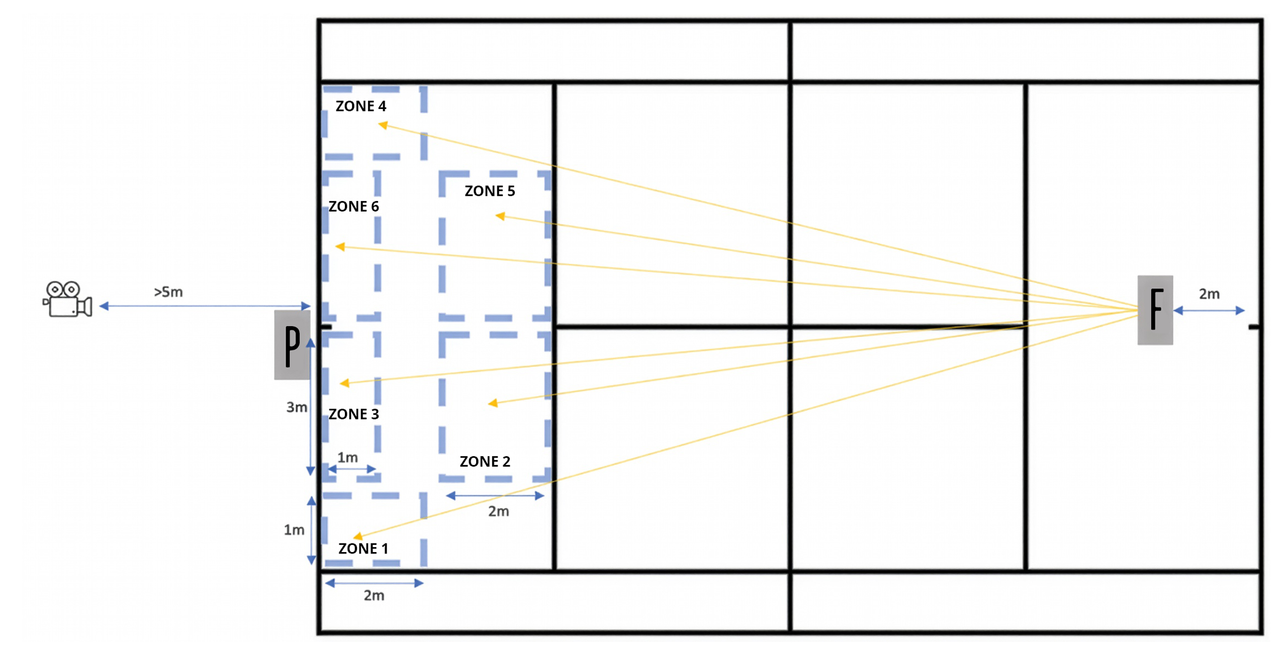 A purpose-designed test, routinely used by the Catalan Tennis Federation, was applied to assess footwork in a subsample of participants (n = 61). The protocol was video recorded and diagrammed, with zones and subzones detailed in Figure 2. Players started from the initial position (P), standing on the service line at the back of the court. A feeder, positioned 2 meters inside the baseline toward the net and aligned with the center of the court, hit the ball with the racket toward the corresponding zone. To standardize the test and ensure that players performed the intended movements, specific court zones were marked where the feeder’s ball had to bounce. When the ball did not bounce in the designated zone, the trial was repeated.