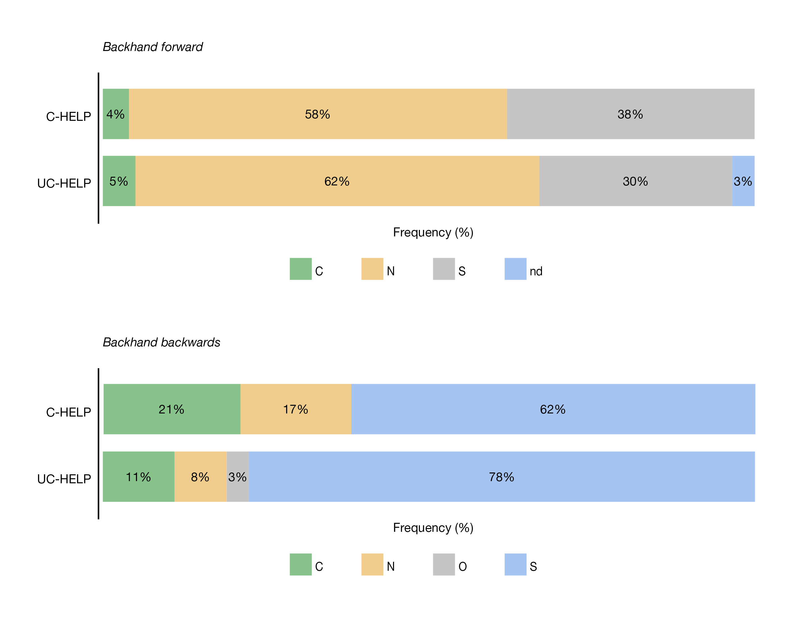 In backhand strokes with forward and backward movement, the data indicated a general preference for the neutral stance (N) in forward movements (60.7%) and the semi-open stance (S) in backward movements (72.1%) (Figure 8), with no statistically significant differences between C-HELP and UC-HELP profiles (Table 2).