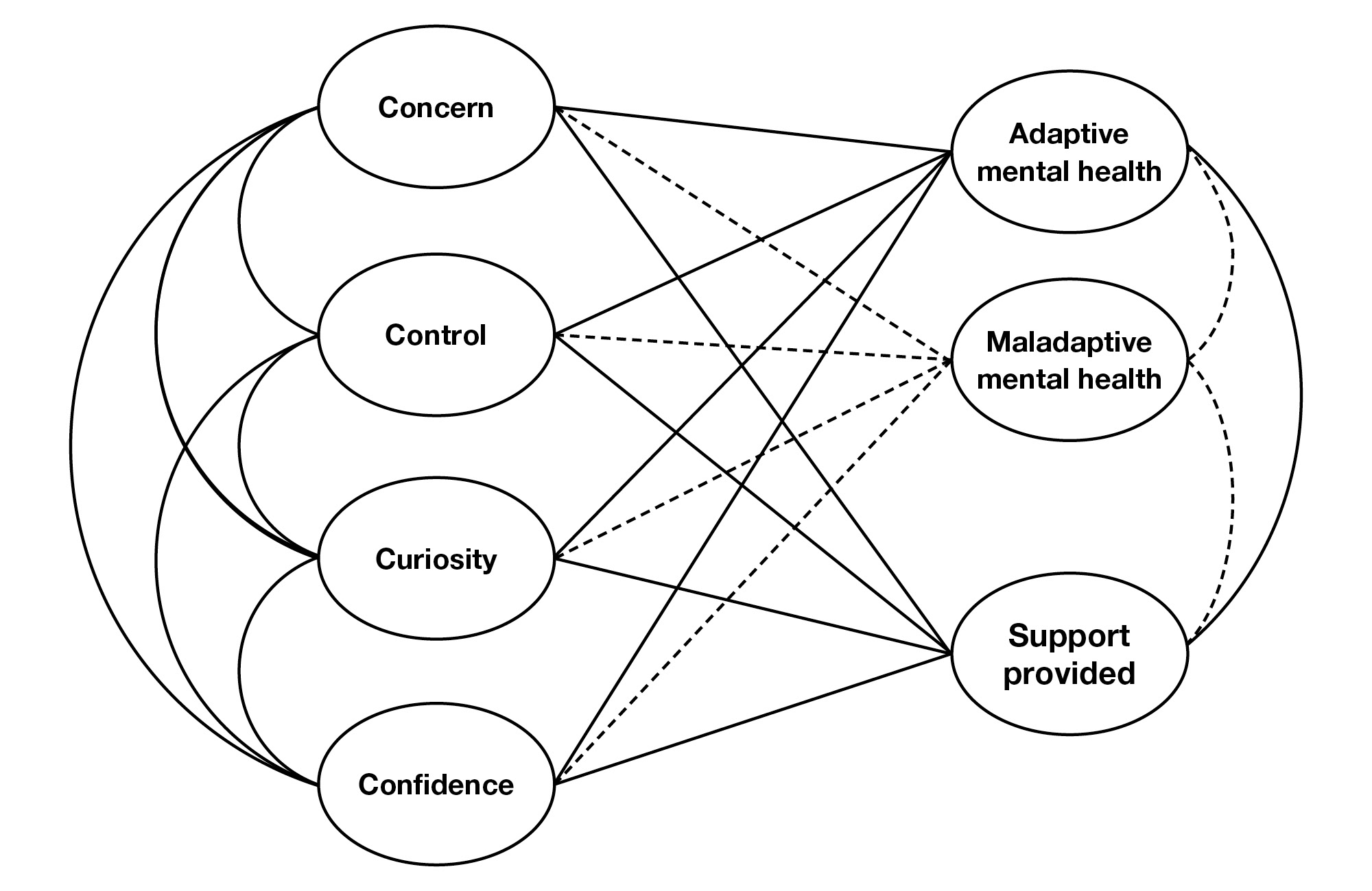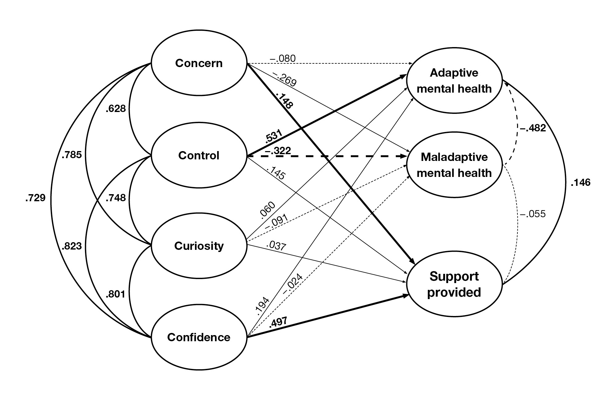 In addition, we provided evidence on CR, convergent validity and discriminant validity. First, we used McDonald’s omega to check the RC of each scale. The results were as follows: ωConcern = .847; ωControl = .816; ωCuriosity = .875; ωConfidence = .911; ωAdaptative mental health = .915; ωMaldaptative mental health = .869; ωSupport provided = .931. The value for the overall measurement model was ω = .953. All values were > .70, indicating good reliability. In terms of convergent validity, all items in the study showed significant loadings on their latent factor (> .50), with most of the factor loadings being > .70. In terms of discriminant validity, we found no cross-loaded items and correlations between latent factors were ≤ .80. Overall, we consider the results of the general measurement model to be adequate to continue with the next steps of the data analysis.