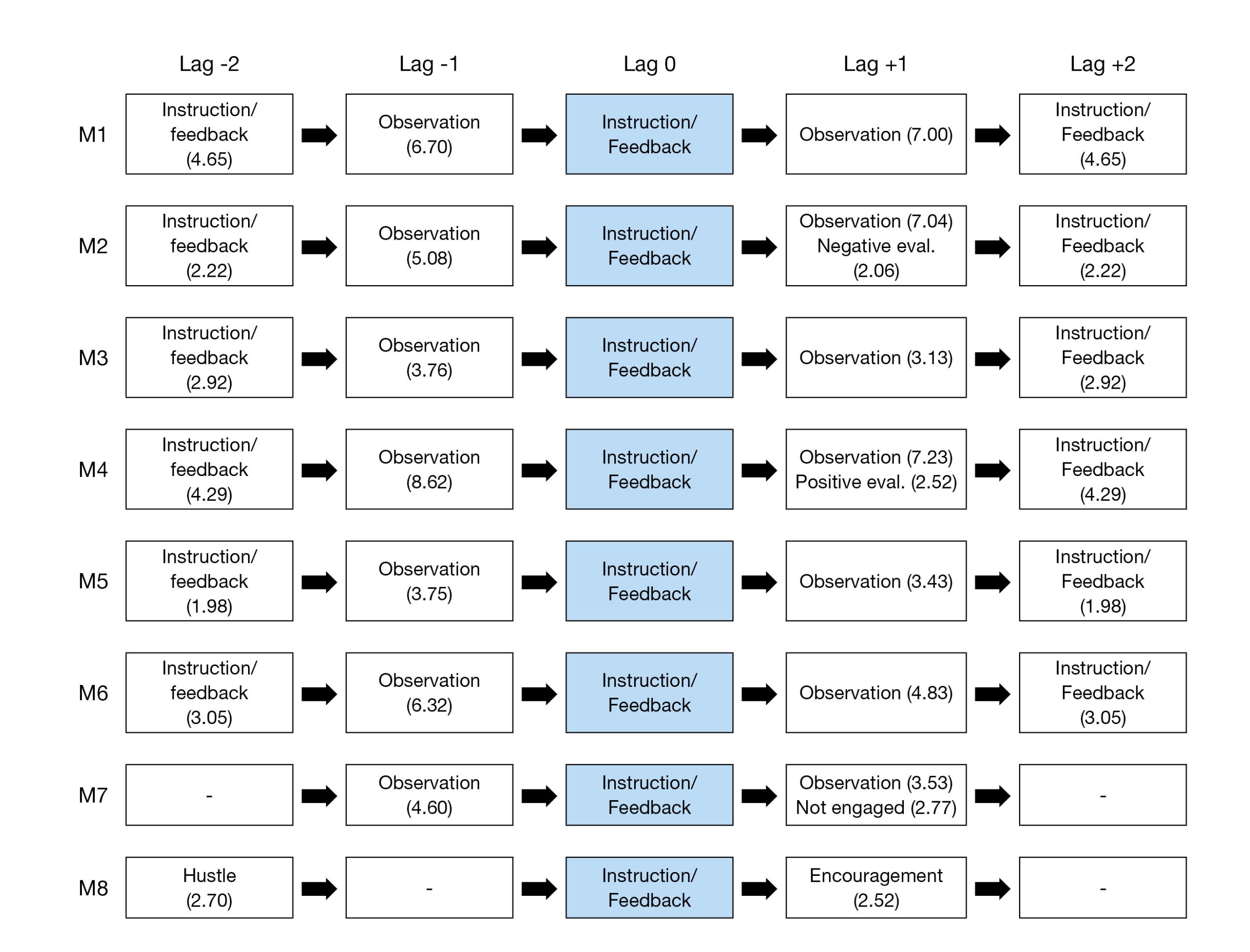 Considering the first specific study objective was to explore the behavior sequences of the eight coaches when giving instruction/feedback, the instruction/feedback content code was selected as the benchmark behavior, which is located at lag 0 in the action chain, and the adjusted residuals were calculated for the behaviors that were considered paired (all the content codes). Based on the positive adjusted residuals greater than 1.96, the behavior patterns were extracted for the eight coaches. Figure 1 shows the lags included because they presented a sequence with values higher than the cut-off point established for the evaluated coaches (from lag -2 to +3). The results reveal little variation among the coaches and represent the basic sequence of the study participants, characterized by the instruction/feedback and observation behaviors, with the exception of coach M8, who did not present a clear behavior sequence and exhibited hustle (lag -2), encouragement (+1), and general communication (+3).