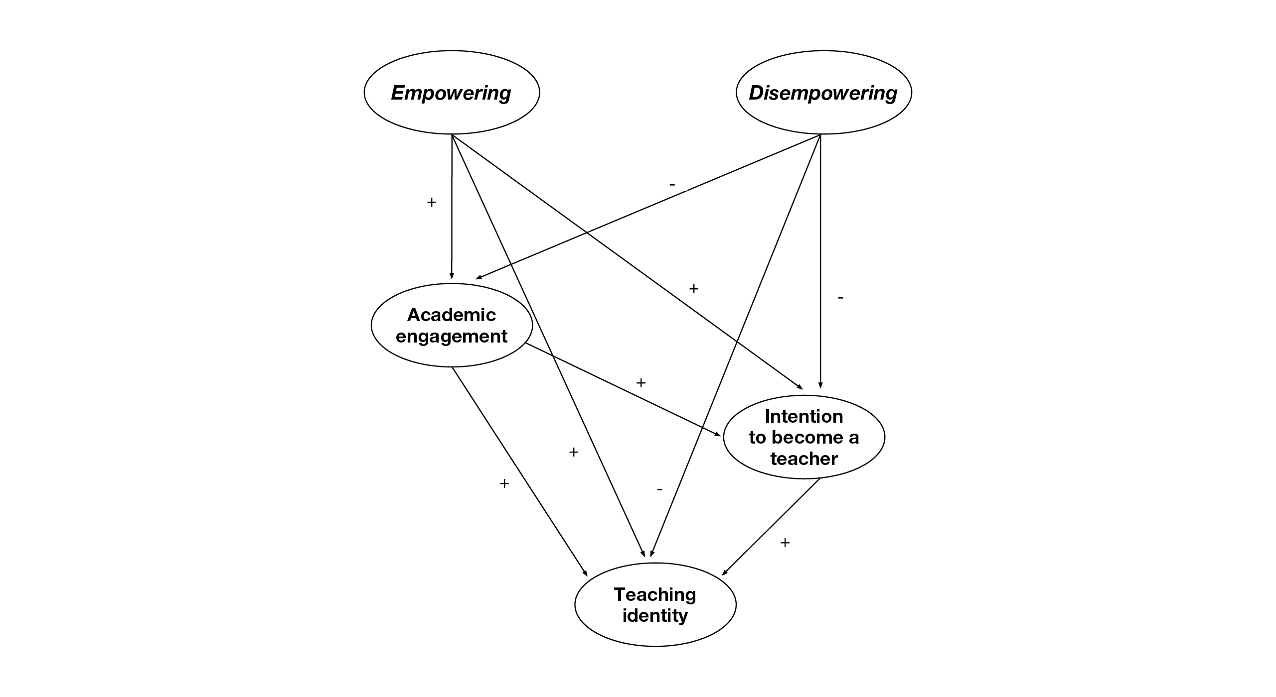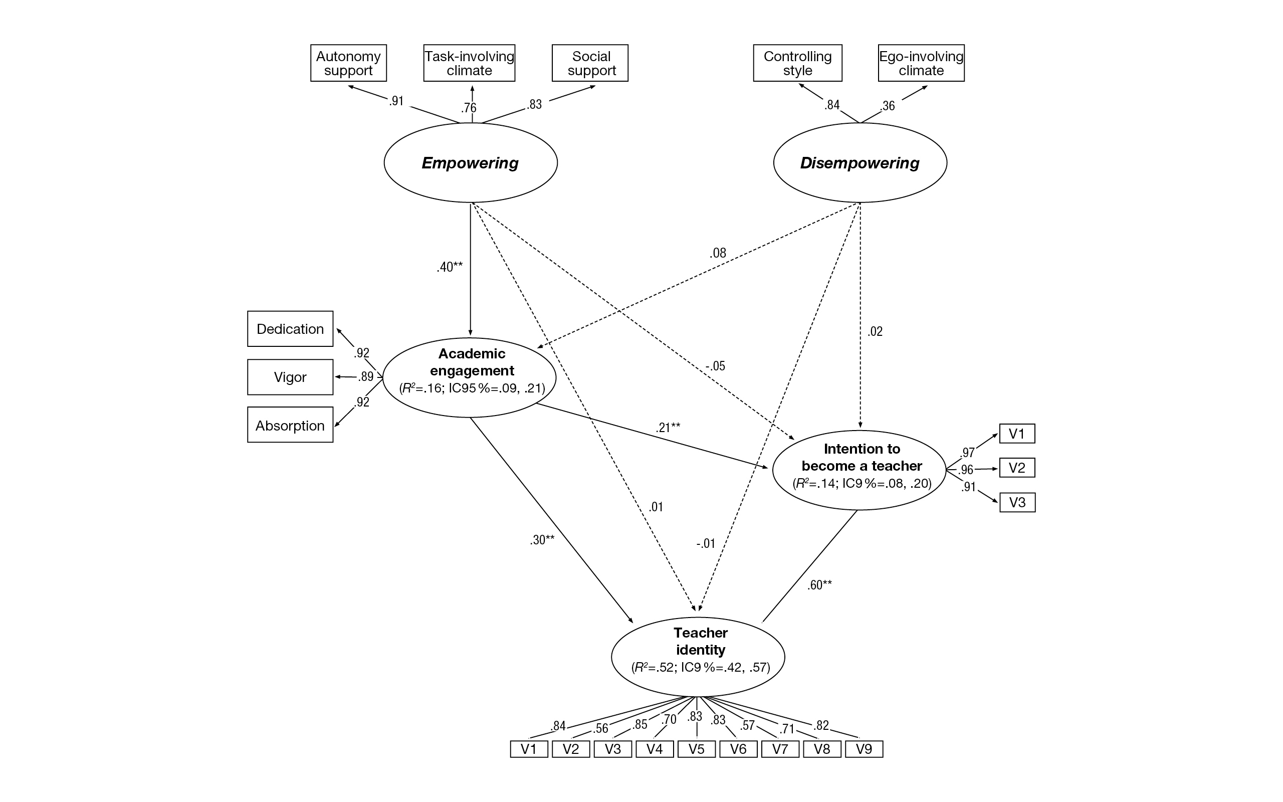 Although the classroom motivational climate has been identified as the cornerstone of all educational outcomes because it is intrinsically linked to the quality of the teaching–learning process (OECD, 2020), recent educational trends have highlighted the need to combine elements drawn from Achievement Goal Theory (AGT; Ames, 1992) and Self-Determination Theory (SDT; Ryan & Deci, 2017). To examine in greater depth the influence of the social environment in the classroom, Duda and Appleton (2016) outlined a hierarchical, integrative, and multidimensional conceptualization that incorporates the main dimensions of the social environment within AGT (task- and ego-involving climates) and SDT (autonomy support, control, and social support). According to Granero-Gallegos et al. (2023), and following Duda and Appleton’s (2016) conceptualization, a teacher educator creates an empowering climate when they provide pre-service teachers with opportunities for choice (autonomy support); establish interpersonal criteria for success based on skill development, effort, and cooperation (task-involving climate); and make them feel valued and cared for as individuals (social support). In contrast, a teacher educator creates a disempowering climate when they establish interpersonal relationships based on rivalry and competitiveness (ego-involving climate) and use controlling and pressuring strategies so that students feel, think, and act in a particular way (controlling style). Drawing on Duda and Appleton’s (2016) multidimensional conceptualization and previous studies (Simon et al., 2025; Milton, Appleton et al., 2025), an empowering climate is expected to foster cognitive elements that are intrinsic to the education process, such as academic engagement, which can stimulate intentionality toward teaching behavior (e.g., intention to become a teacher) and, consequently, promote the development of teaching identity (Milton et al., 2025; Granero-Gallegos et al., 2025; López-García et al., 2022). Conversely, a disempowering climate is likely to undermine the cognitive processes developed by pre-service teachers, such as intention to become a teacher or academic engagement, thereby hindering the construction of a strong teaching identity (Milton et al., 2025; Granero-Gallegos et al., 2024; López-García et al., 2023).