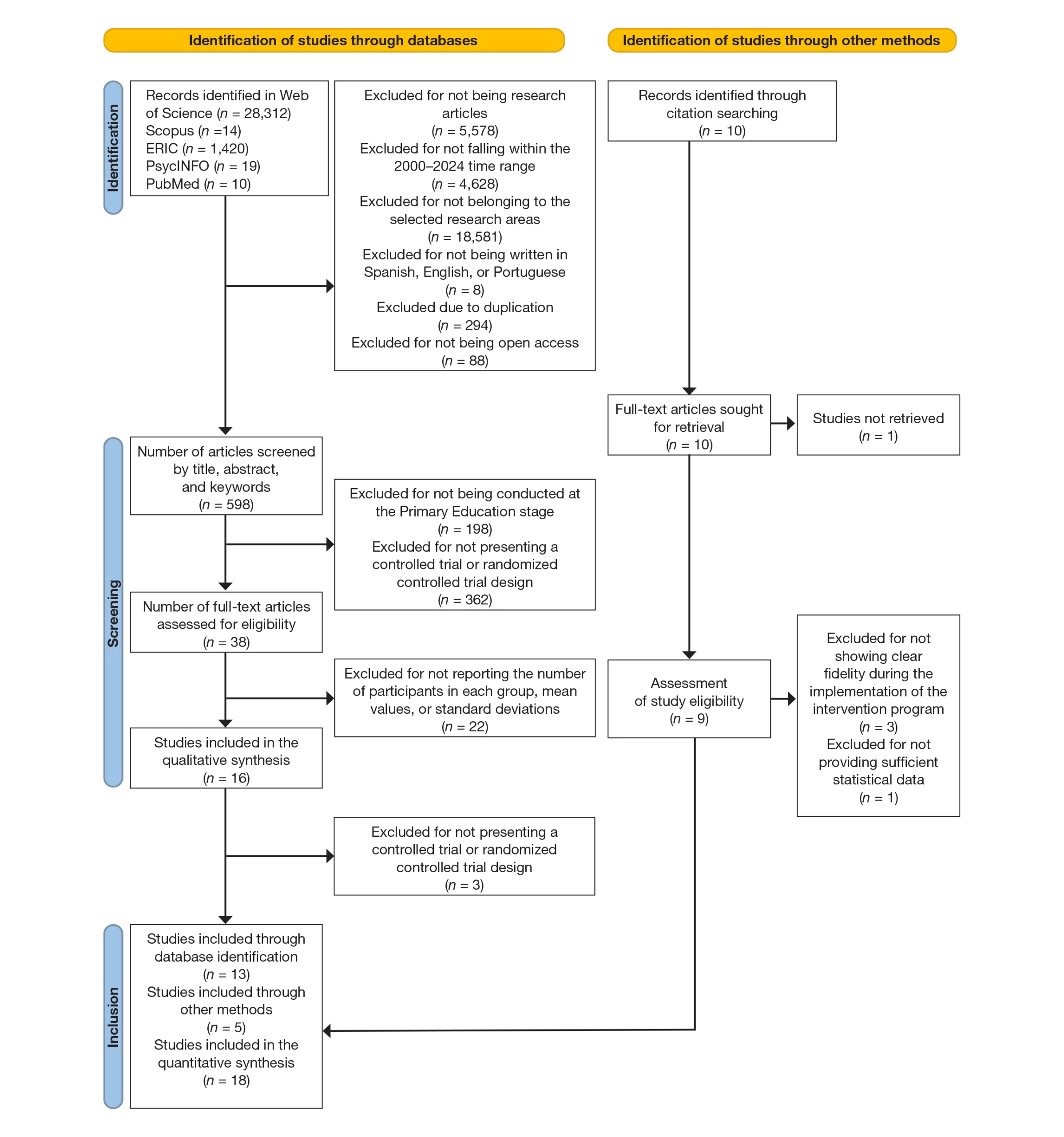 Figure 1 presents the flow diagram followed to obtain the scientific articles that make up the research sample. In the identification phase, a total of 29,798 records were initially collected through searches in Web of Science, Scopus, ERIC, PsycINFO, and PubMed. Additionally, 10 records were identified through manual citation searching. A large number of studies were excluded for the following reasons: not being research articles (n = 5,578), not belonging to the established time range (n = 4,628), not falling within the selected research areas (n = 18,511), and not being written in Spanish, English, or Portuguese (n = 8). Studies that were duplicated (n = 294) and those that were not available in open access (n = 88) were also excluded. A total of 598 scientific articles passed this initial screening phase.