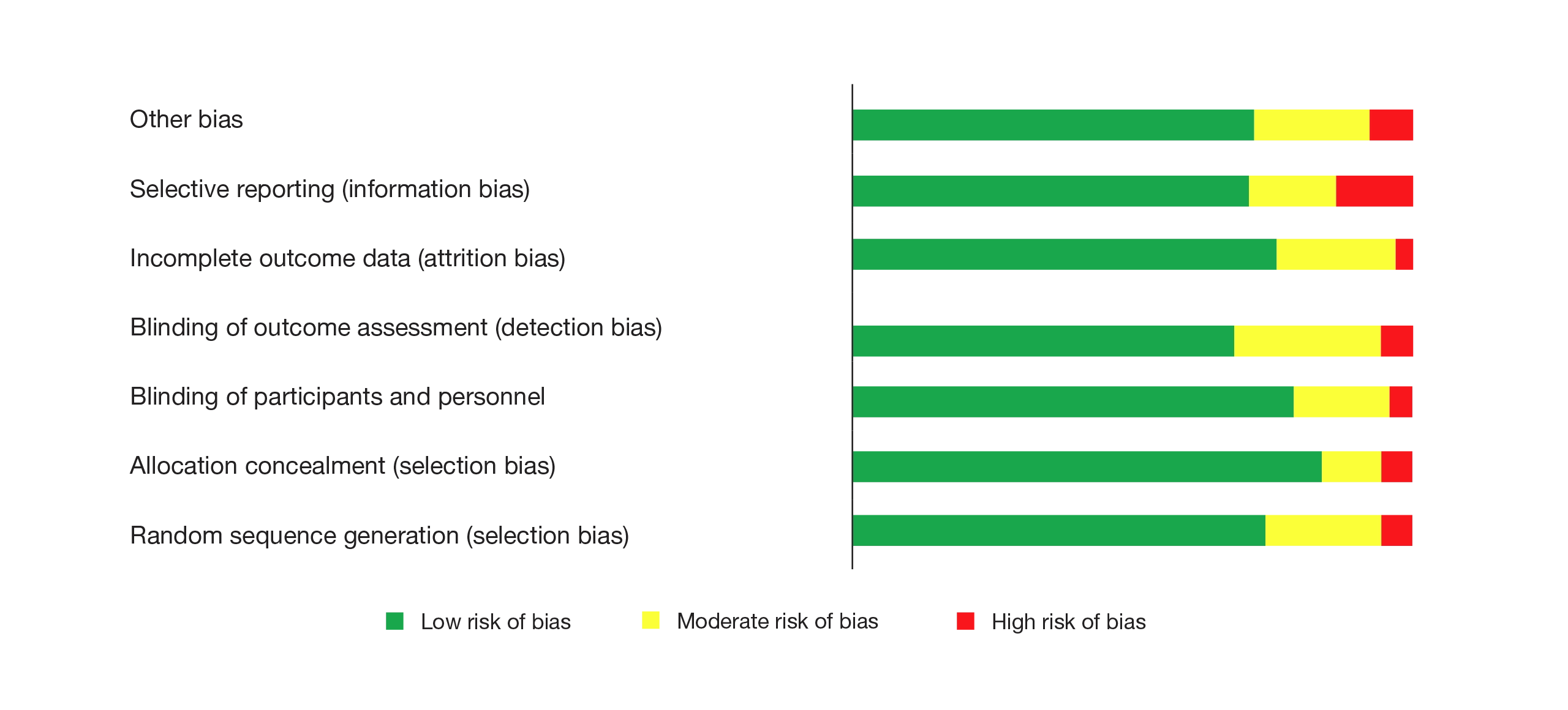 Figure 2 presents the distribution of bias across the different dimensions. A total of 18 scientific articles were analyzed. The lowest risk of bias was observed in allocation concealment (n = 15; 84.22%) and in the blinding of participants and personnel (n = 14; 78.96%). The dimensions with the highest presence of moderate bias were blinding of outcome assessment (n = 5; 26.26%) and other biases (n = 4; 21.04%).
