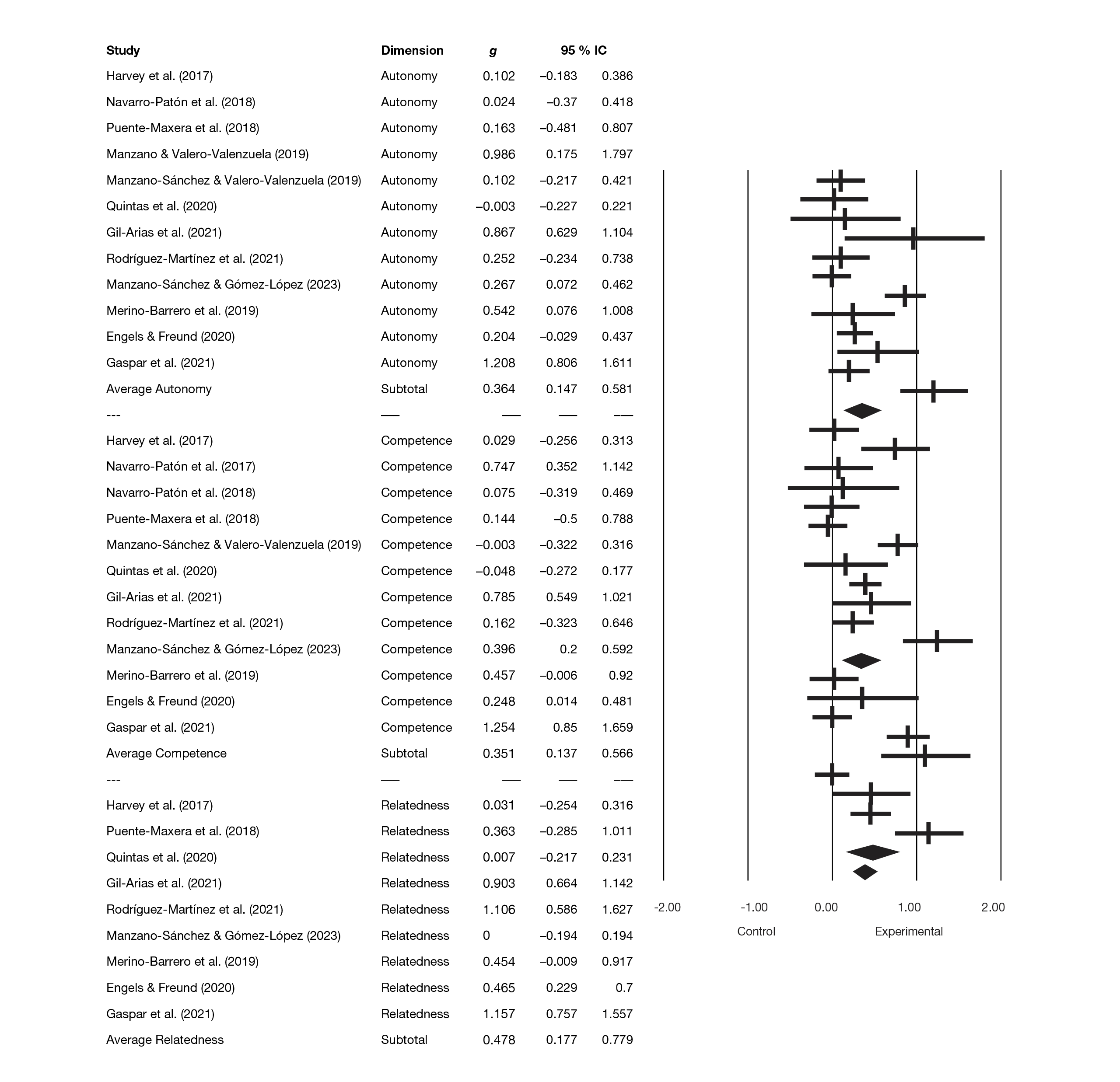 With regard to competence satisfaction, the results show that the application of pedagogical models in the Physical Education subject has a positive but small effect. Pedagogical models allow students to assume graded challenges, receive formative feedback and observe personal progress in their performance (Gil-Arias et al., 2021; Engels & Freund, 2020; Iglesias et al., 2023; Puente-Maxera et al., 2018). These models, by focusing on active participation, teamwork and process-based assessment, facilitate the experience of success that nurtures the feeling of competence (Engels & Freund, 2020; Puente-Maxera et al., 2018). However, the reduced effect suggests that the mere application of pedagogical models does not guarantee a substantial change; rather, it is the way in which the teacher adapts activities, organizes resources and accompanies learning that determines whether students truly feel competent (Manzano-Sánchez & Valero-Valenzuela, 2019). In this sense, their application should consider not only the methodological structure, but also the pedagogical intentionality of teachers in order to personalize challenges and make them achievable according to the characteristics of each group (Quintas et al., 2020).