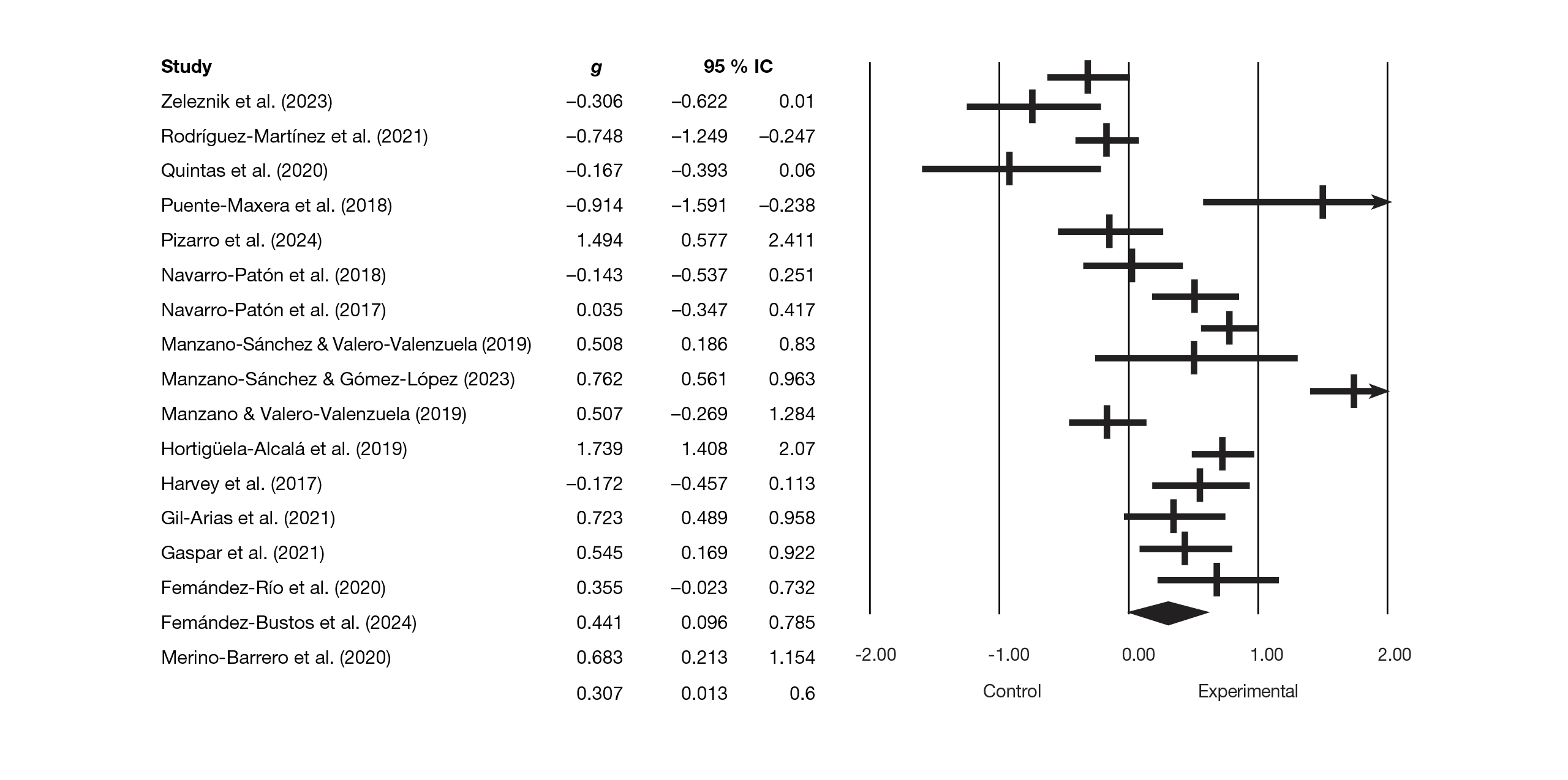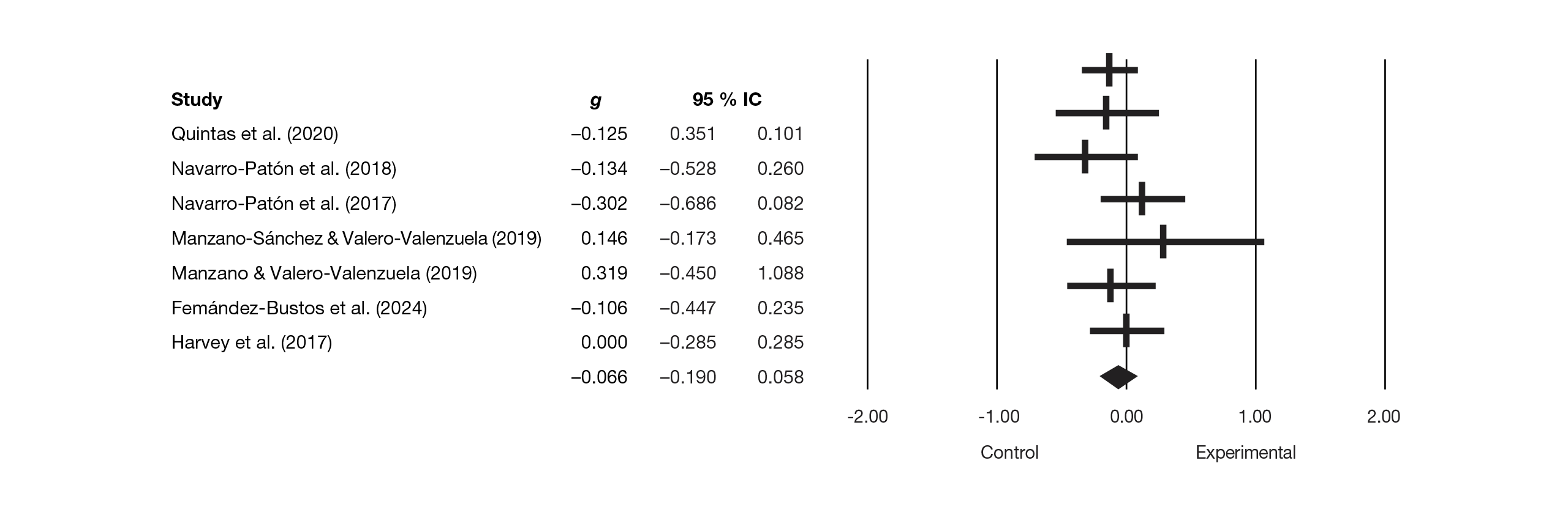 With regard to intrinsic motivation, the results show a small and positive effect of the application of pedagogical models. This trend is understandable, as intrinsic motivation largely depends on the satisfaction of basic psychological needs (Ryan & Deci, 2017). Pedagogical models offer favorable conditions for this; however, the short duration of some interventions or fidelity in the degree of implementation may have limited their capacity to generate significant changes (Hortigüela-Alcalá et al., 2019; Puente-Maxera et al., 2018). At the Primary Education stage, students are still in a process of discovering physical activity, so fostering stable intrinsic motivation requires time, varied experiences and a classroom climate that values both the process and enjoyment of the activity (Manzano-Sánchez & Valero-Valenzuela, 2019; Pizarro et al., 2024; Quintas et al., 2020).