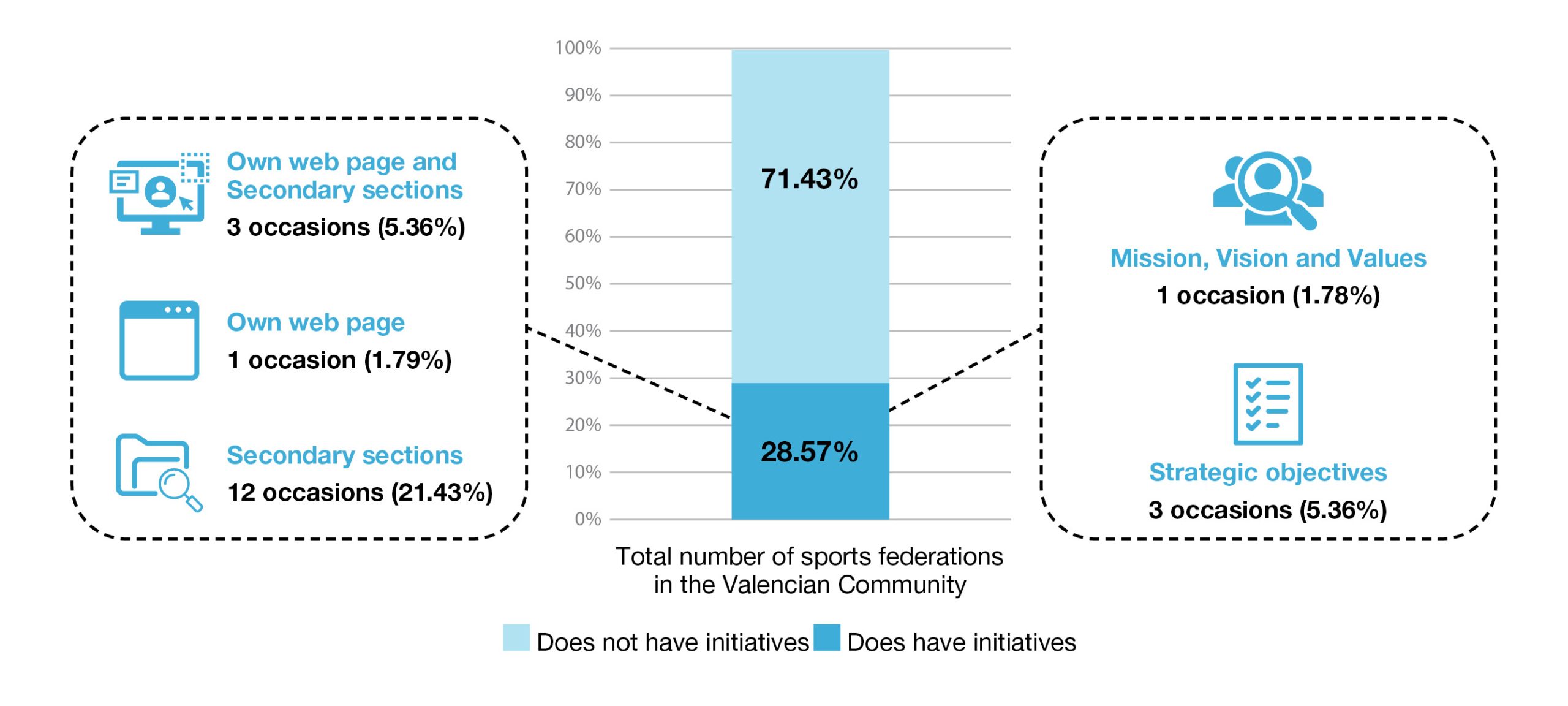 From the initial study results, we can highlight that of the 58 sports federations in the Valencian Community, only two did not have an official website, leaving us with 56 as the subject of the study. Of those, only 16 (28.57%) included some kind of initiative in the available information. These were presented on a section of the website dedicated to sustainability on one occasion (1.79%); for 12 federations (21.43%), the initiatives were presented in secondary sections of the website, and on three occasions (5.36%) they were presented in both a dedicated section and in other secondary sections of the website (see Figure 1).