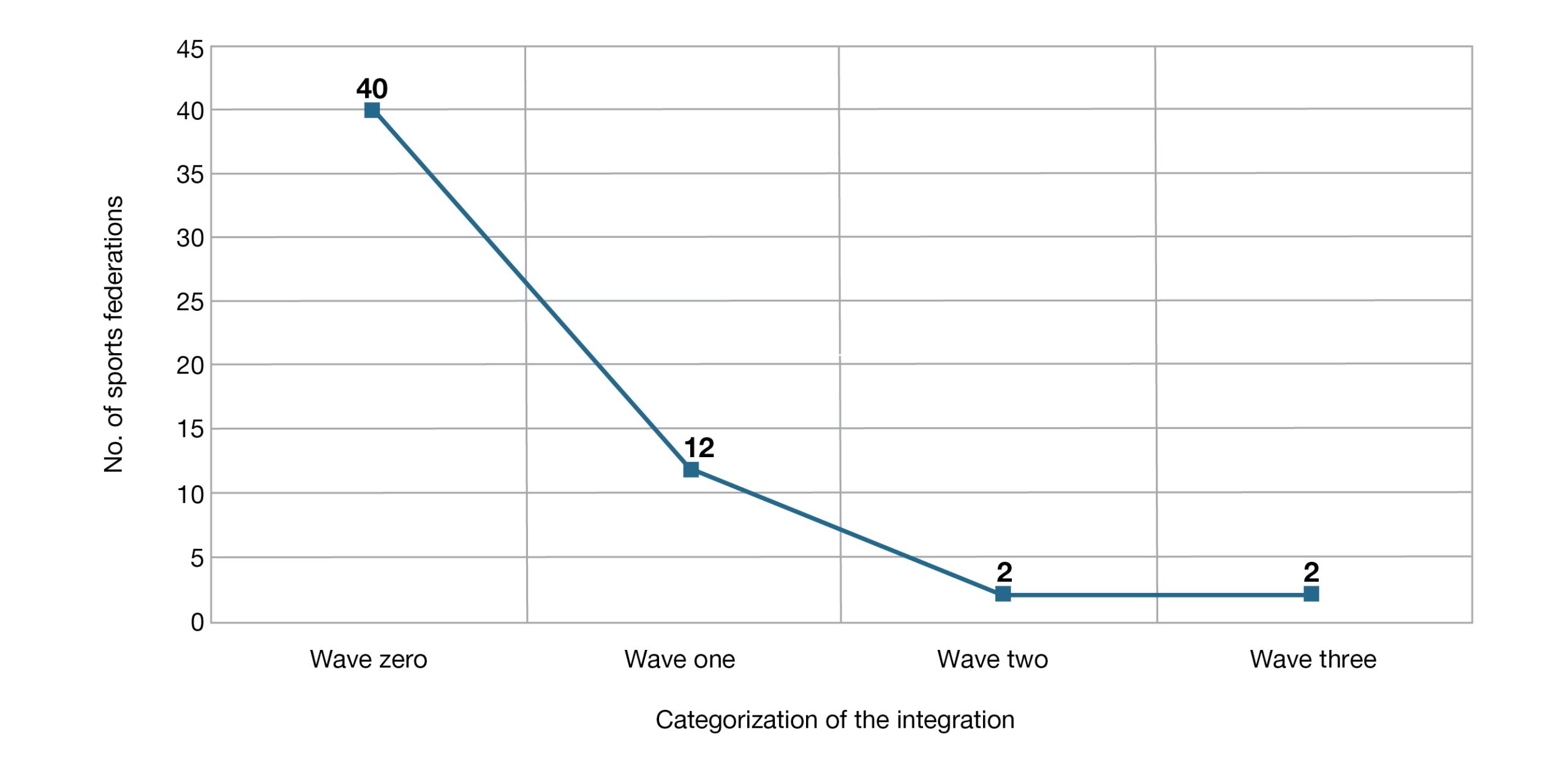 Lastly, as seen in Figure 2, according to the wave typology used to analyze the degree of sustainability integration in sports federations in the Valencian Community, we observed that 71.43% (n = 40) of the federations were in wave zero, 21.43% (n = 12) in wave one, two of the federations (3.57%) were in wave two and the two remaining federations (3.57%) were in wave three. The Valencian Federation for Mountain and Climbing Sports and the Valencian Triathlon Federation were the two federations that had integrated sustainability the most into their activities.