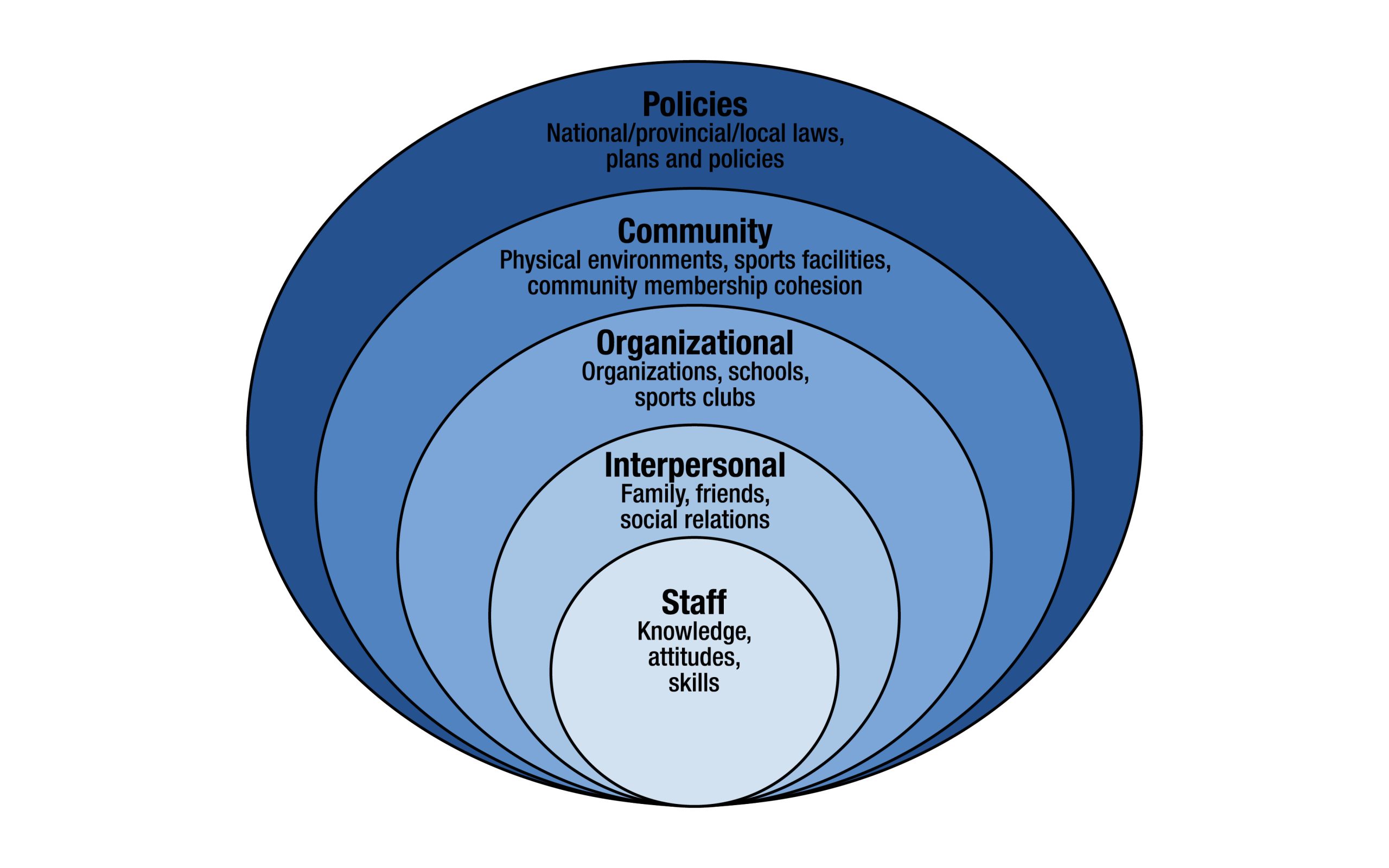 One of the approaches that addresses the interaction of different factors and levels is the socioecological model (McLeroy et al., 1988). This model suggests that health is not only the result of individual factors but also of social and environmental interactions. It is made up of five levels (Figure 1): personal (knowledge, attitudes, and skills); interpersonal (family, friends, school relationships); organizational (associations, sports federations, and cohesion with community members); community (physical environments, sports facilities); and public policies (laws, regulations, and plans at the state, regional, or local level).