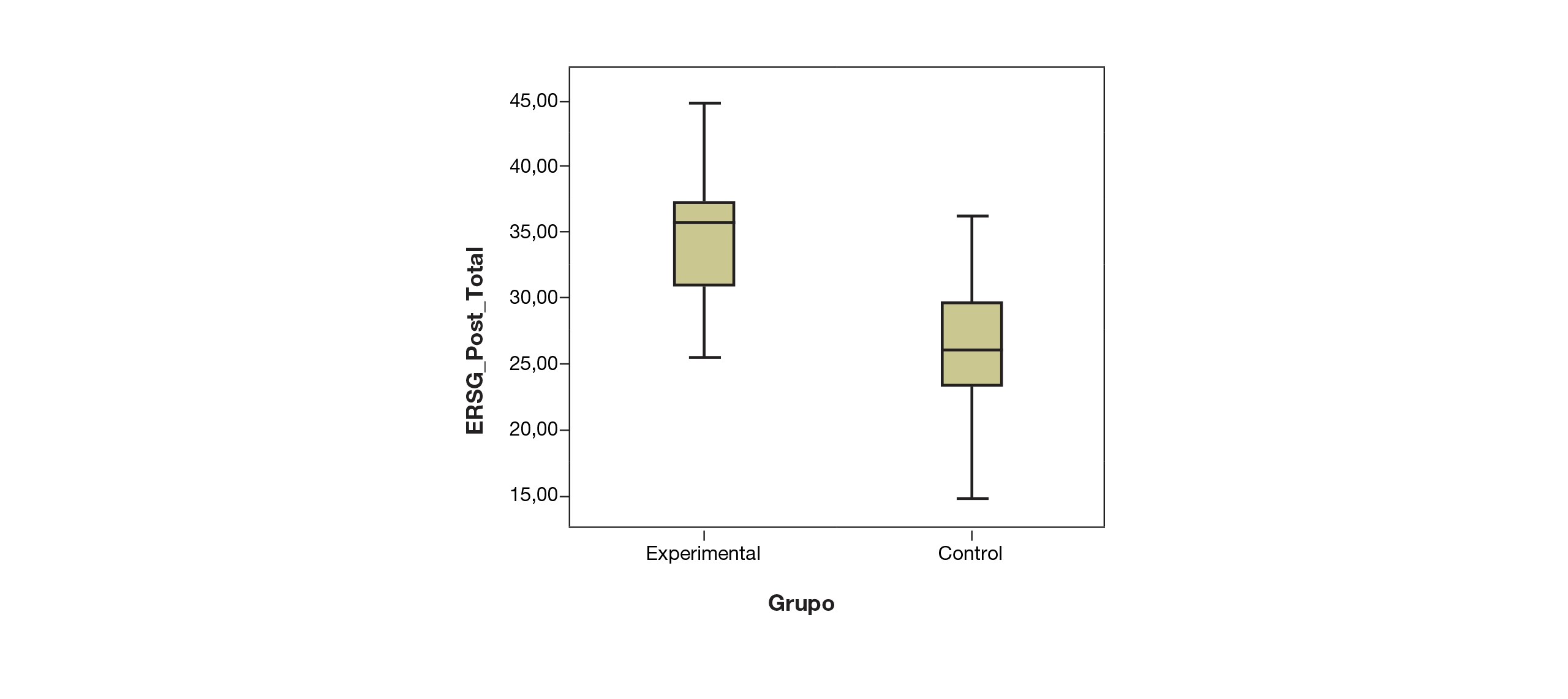 Antes de la intervención, se evaluó la equivalencia basal entre los grupos experimental y control en todas las dimensiones del ERSQ mediante pruebas t para muestras independientes. Los resultados indicaron que no se observaban diferencias estadísticamente significativas en ninguna dimensión (ts(12) < 1.25, ps > .23; IC 95 % mediante bootstrap [–3.34, 1.88]), lo que sugiere que ambos grupos eran comparables al inicio del estudio. Esta equivalencia inicial permitió atribuir con mayor confianza los cambios posteriores a la intervención y no a diferencias previas entre los grupos (véase la Tabla 5).
