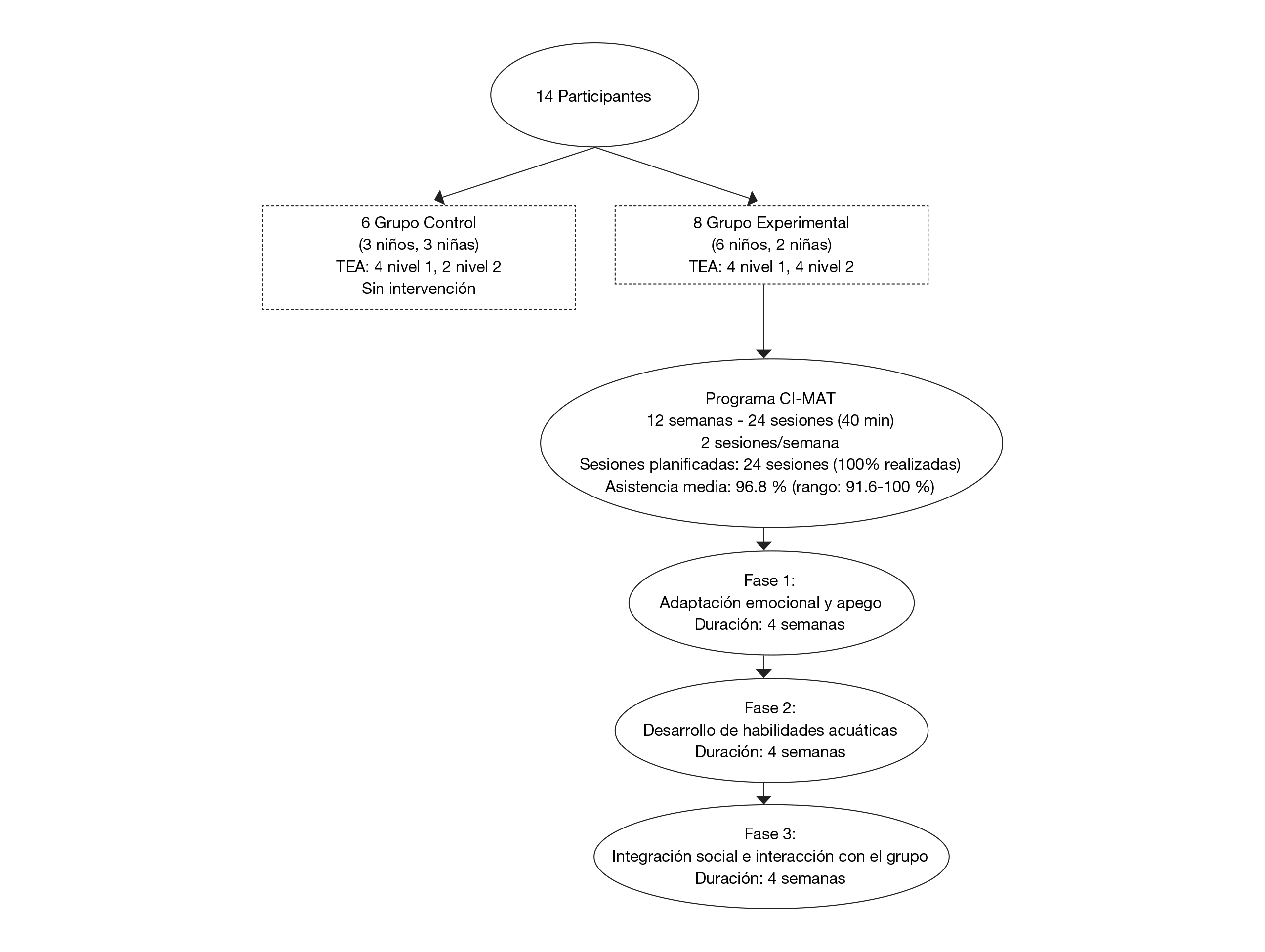 A continuación, se detalla la intervención llevada a cabo con el programa CI-MAT. Los niños que cumplían los requisitos establecidos para participar realizaron un total de 24 sesiones de 40 minutos cada una, a lo largo de 12 semanas (dos por semana). Se dividió a los alumnos en dos grupos: experimental y control. En el grupo experimental (8 participantes) se trabajó a través del programa CI-MAT, mientras que el grupo control (6 participantes) no realizó ningún tipo de trabajo en el agua, siguiendo su rutina escolar normal con clases de educación física (Figura 1).